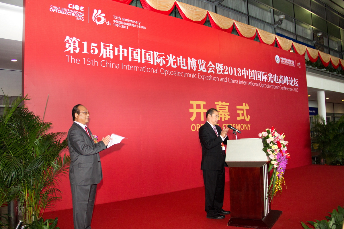 9月4日,在深圳召開的“第十五屆中國國際光電博覽會暨2013中國國際光電高峰論壇”上,集團屬下的華策光通信科技有限公司推出的“基于位置服務的白光通信技術” 受到與會國內外同行及專家、學者的高度關注和一致好評。圖為開幕式現場。